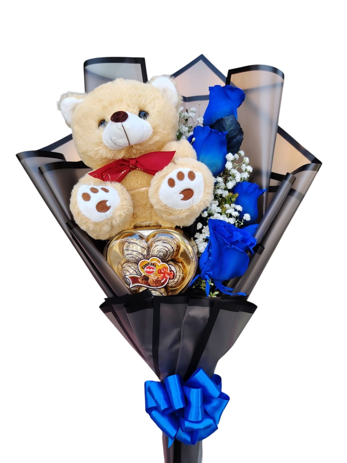 Un detalle único y sofisticado que combina ternura y buen gusto: osito de peluche, rosas azules y chocolates, ideal para sorprender con estilo.